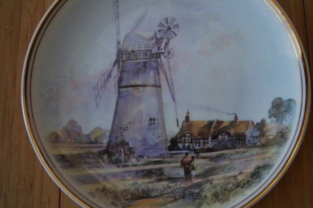 jakościowa porcelana ozdobiona nadrukiem z motywem wiejskim, gdzie motyw przewodni stanowią wiatraki