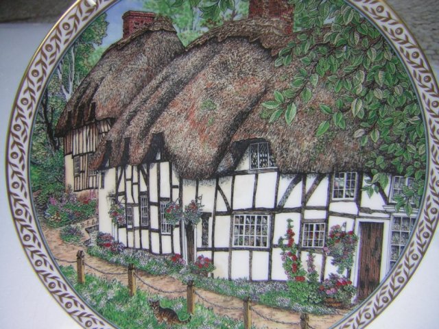 Mocna,szlachetna porcelana i dużej urody zdobienie. Sielankowy obrazek z dawnych wiejskich czasów Piękna stara architektura..malwy i ....kotek ;). Malatura wysokiej jakości., wręcz można dotknąć strzechy...kolory żywe, wyraziste , miłe dla oka. Szlaczek na rancie złocony. . Wykończenie błyszczące. Dodaję profesjonalny uchwyt do powieszenia :)