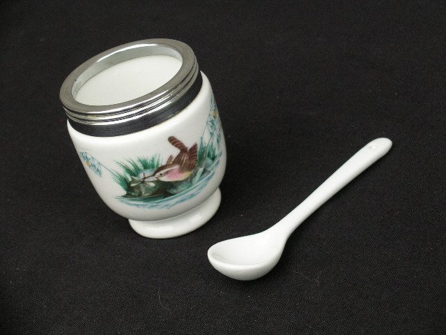 Szlachetnie i grubo-porcelanowy pojemnik, oryginalnie z nakręcanym wieczkiem metalowym, służący do podawania gotowanego jajka z dodatkami, w angielskim stylu. Bez wieczka jako przyprawnik lub inne kuchenne naczynko z powodzeniem służyć może - dołączamy doń porcelanową łyżeczkę dla równowagi w użytkowaniu :) Ptasie zdobienie. Błyszczące szkliwienie. Jakość wykonania. Dół 3,5; góra 5,5; wysokość 7 cm. Stan zachowania bardzo dobry minus użytkowania ślady na stópce.