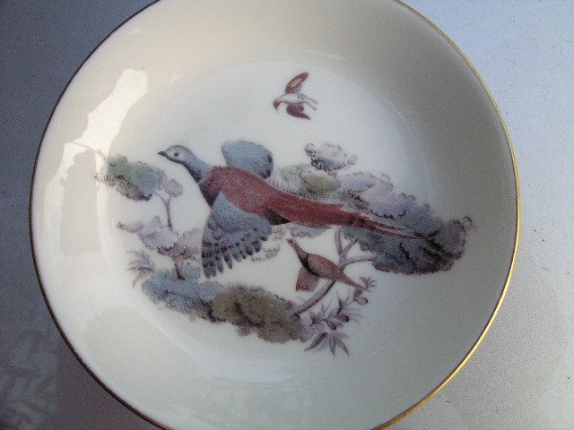 Ta lerzyk-spodek porcelanowy, sygnowany Royal Worcester Fine Bone China Made in England Na cieplej bieli porcelany delikatne i subtelne ptasie zdobienie. Stonowane barwy miłe dla oka. Złocony rant wykończenie błyszczące.