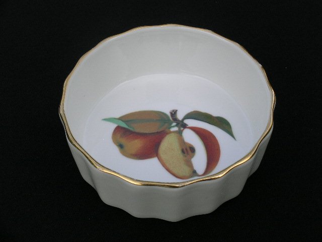 Szlachetnie porcelanowa większa salaterko-miseczka, sygnowana jakością Royal Worcester, z serii 51. Tutaj jabłkowo zdobiona. Ryflowanie, złocenie i błyszczące szkliwienie. Nadaje się do zmywarki. Jakość wykonania. 10,5 x 3,6 cm. Stan zachowania bardzo dobry.