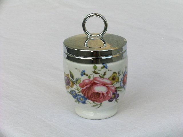 Szlachetny, praktyczny i wyjątkowy pojemnik do przygotowywania, gotowania i podawania jajek w stylu angielskim, sygnowany jakością Royal Worcester - solidna gruba porcelana, na błyszcząco szkliwiona. Chromowa przykrywka na gwint nakręcana, ze specjalnie przygotowaną dziurką uchwytową do wyjmowania z wrzątku. Stylowe kwiatowe zdobienie. Dół 3,5; średnica 5,5; wysokość 9 cm. Stan zachowania bardzo dobry. Oryginalny, w apetycznym, angielskim stołowym stylu :)