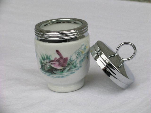 Szlachetny, praktyczny i wyjątkowy pojemnik do przygotowywania, gotowania i podawania jajek w stylu angielskim, sygnowany jakością Royal Worcester - solidna gruba porcelana, na błyszcząco szkliwiona. Chromowa przykrywka na gwint nakręcana, ze specjalnie przygotowaną dziurką uchwytową do wyjmowania z wrzątku. Stylowe ptasie zdobienie. Dół 3,5; średnica 5,5; wysokość 9,5 cm. Stan zachowania bardzo dobry. Oryginalny, w apetycznym, angielskim stołowym stylu :)