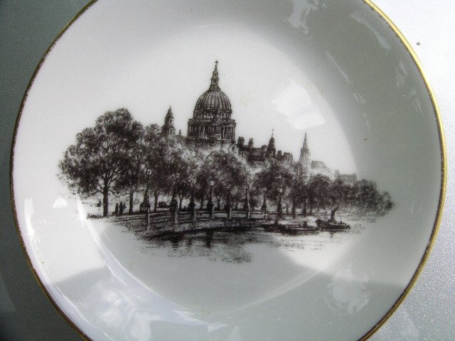 Talerzyk spodek porcelanowy, sygnowany Worcester Bone China England. Jakościowy. Zdobienie wewnatrz czarno-biała grafika precyzyjną kreską rysowana. ST PAULS CATHEDRAL. Złocenie na rancie. Biała porcelana,wykończenie błyszczące. Średnica góry 10; dół 6wysokość 2 cm.