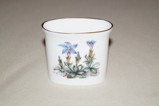 Porcelanowy pojemniczek na wykałaczki sygnowany ROYAL WORCESTER Fine Bone China, delikatna jakościowa porcelana w kolorze mlecznym ozdobiona motywem roślinnym, górny rant złocony, kształt eliptyczny