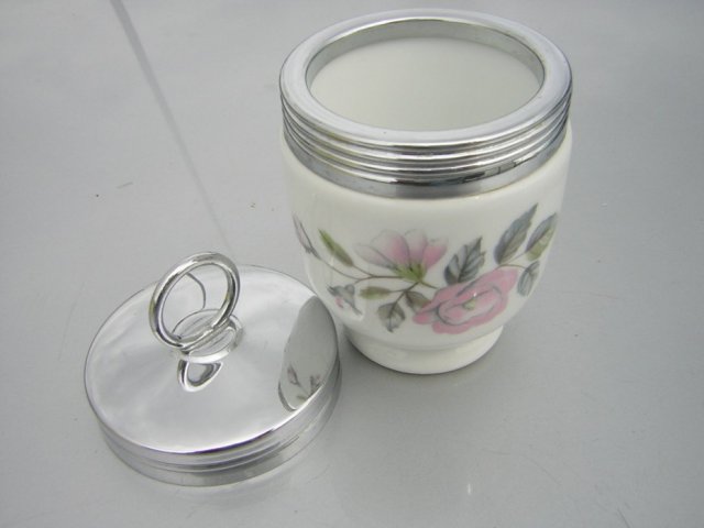 Szlachetny, praktyczny i wyjątkowy pojemnik do przygotowywania, gotowania i podawania jajek w stylu angielskim, sygnowany jakością Royal Worcester - solidna gruba porcelana, na błyszcząco szkliwiona. Chromowa przykrywka na gwint nakręcana, ze specjalnie przygotowaną dziurką uchwytową do wyjmowania z wrzątku. Stylowe różane zdobienie w eleganckich stonowanych barwach,