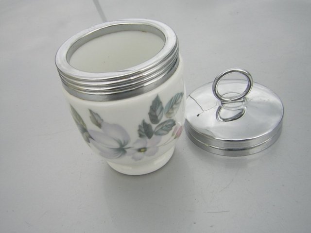 Szlachetny, praktyczny i wyjątkowy pojemnik do przygotowywania, gotowania i podawania jajek w stylu angielskim, sygnowany jakością Royal Worcester - solidna gruba porcelana, na błyszcząco szkliwiona. Chromowa przykrywka na gwint nakręcana, ze specjalnie przygotowaną dziurką uchwytową do wyjmowania z wrzątku. Stylowe różane zdobienie w eleganckich stonowanych barwach,