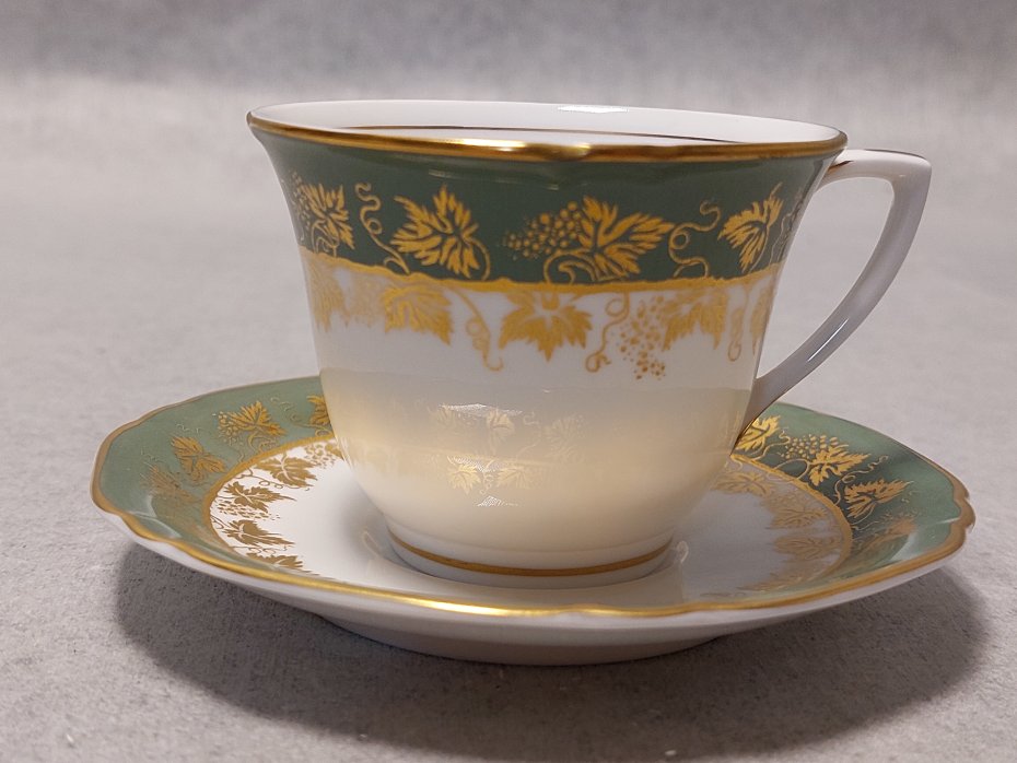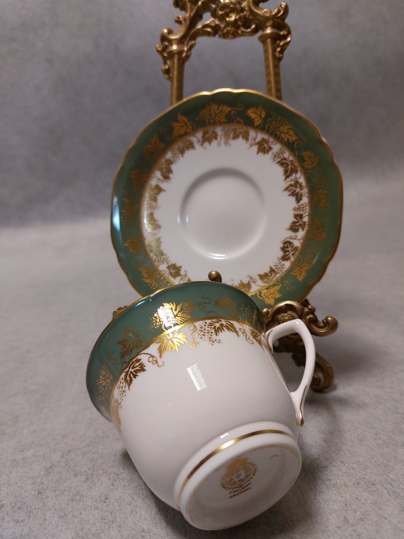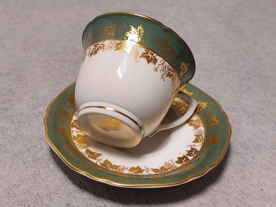 Kolorystyka: Zieleń z elementami złocenia - nadaje porcelanie luksusowy charakter.