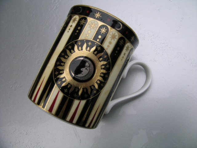 Jakościowa,dzwięcząca biała porcelana na błyszcząco szkliwiona. Rant złocony. Wzór bogaty, saymboliczno-graficzny w eleganckich barwach,bogato złotem okraszony. Na uchu delikatne,eleganckie zdobienie. Cały bardzo harmonijny...kształt,wygodne ucho,doskonała na herbatę, większą kawę wielkość. Klasa i szyk.