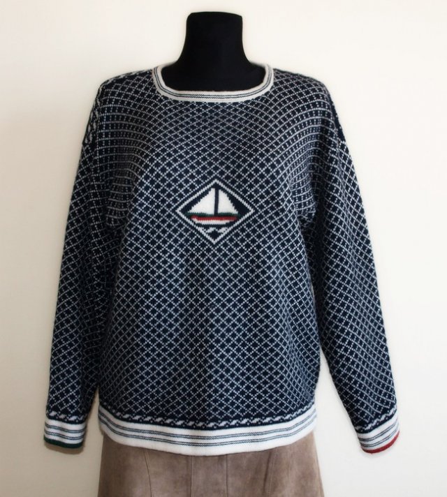 Ciepły, mięciutki sweter marki Royal Yachting, ze 100% wełny. Stan bardzo dobry. Fason o formie prostokąta, ciekawy wzór i detale np. wykończenie jednego rękawa czerwonym paskiem, drugiego zielonym. Rozmiar z metki S, ale ten fason będzie pasował na 38-40. Podaję wymiary mierzone na płasko;