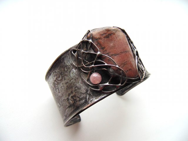 Bransoletka wykonana z miedzi, cyny, jadeitu i rodonitu. Szerokość ok. 3,5 cm. Obwód regulowany.