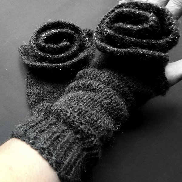 Niezwykle kobiece, długie i miłe w dotyku mitenki wykonane ręcznie z włóczki w kolorze lekko melanżowego grafitu (moher, akryl). Kwiat wykończony srebrną nitką. Długość 33 cm. Projekt autorski. Serdecznie polecam.