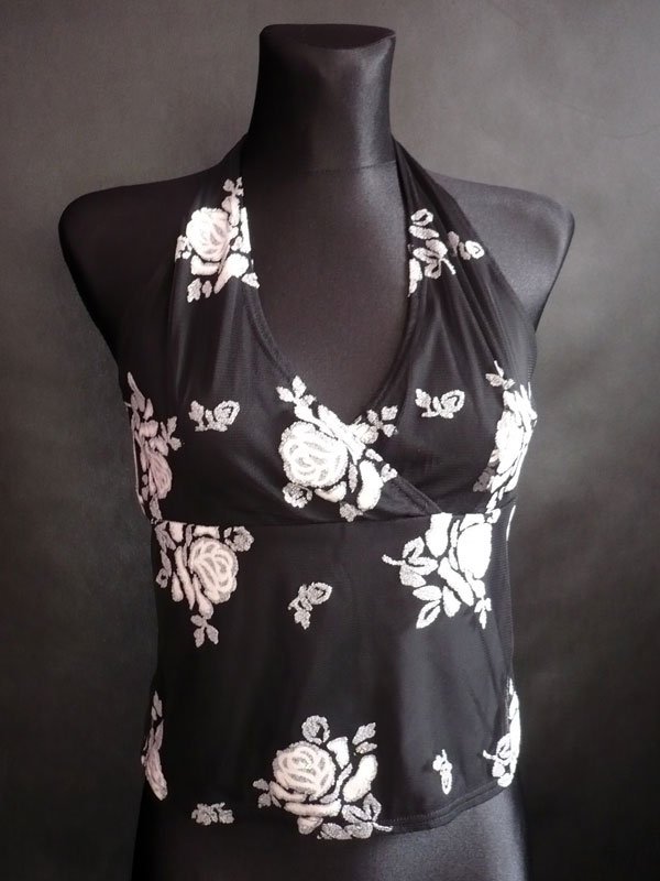 Top z dekoltem amerykańskim, uszyty z tkaniny ozodbionej wypukłymi rózami i cekinami.Odcinany pod biustem.Elastyczny.Przekładany przez szyję.