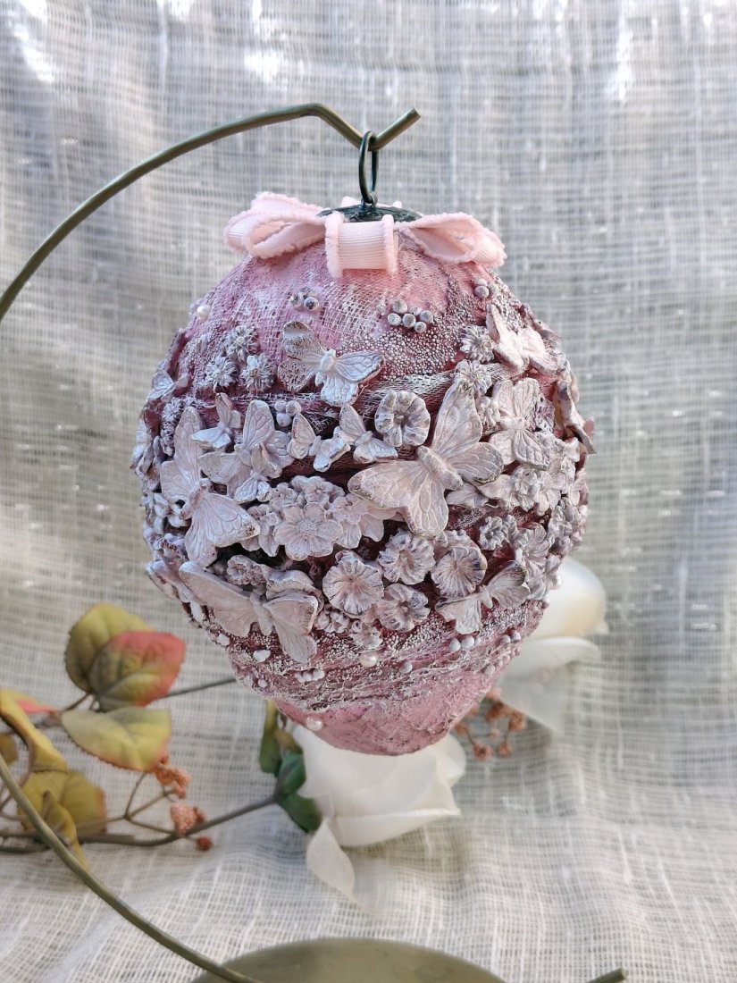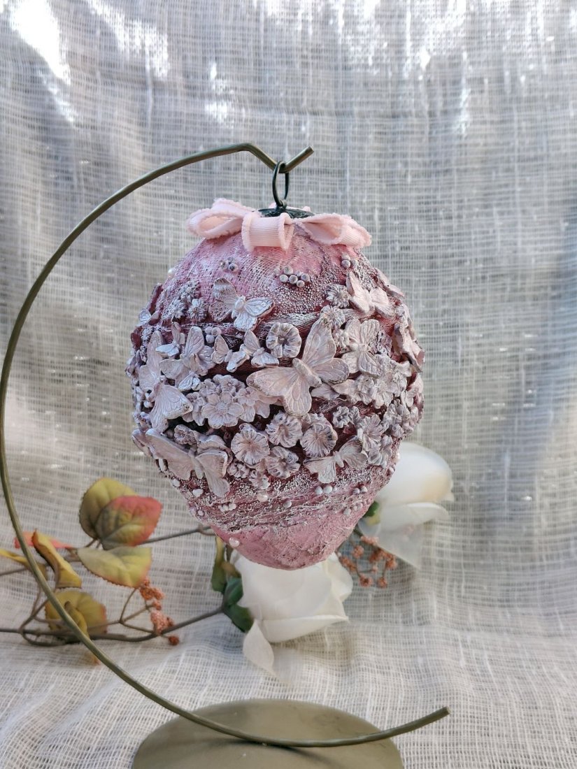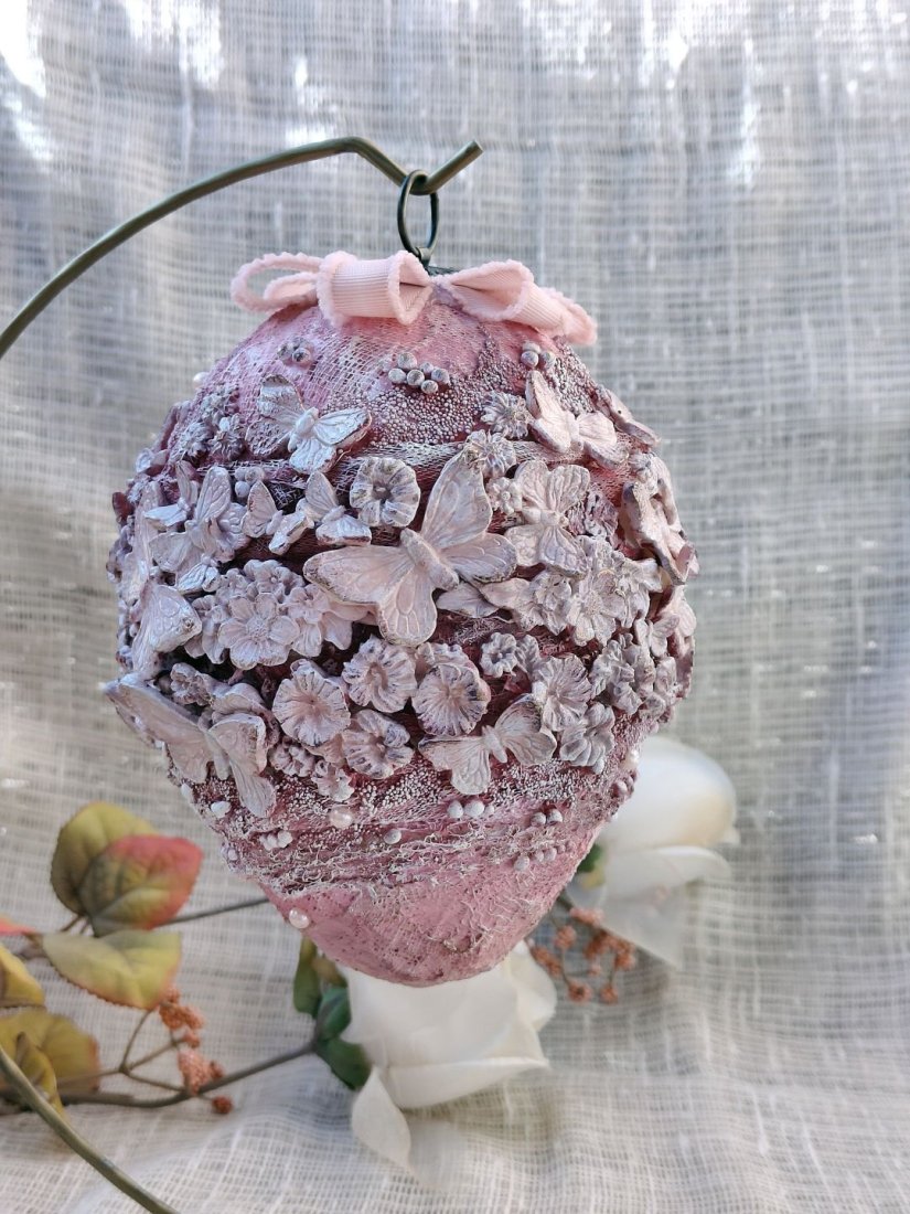 Pozwól, by w Twoim wnętrzu rozkwitła wiosna. Różana Pisanka "Motyli Ogród" to wyjątkowa, ręcznie zdobiona dekoracja, która zachwyca subtelnością detali i romantycznym charakterem. Misternie wykonane motyle oraz kwiaty w formie 3D tworzą efekt delikatnej, kwitnącej kompozycji, otulonej pudrowym różem i perłowymi akcentami.