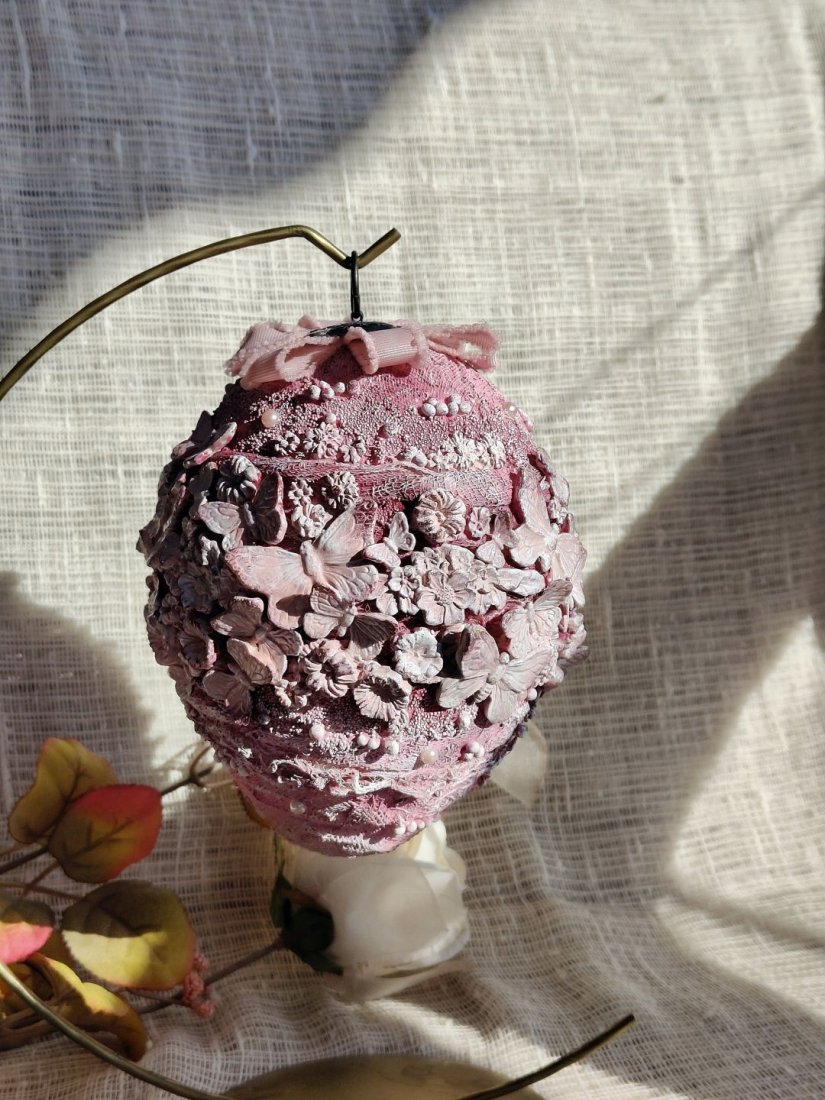 Strukturalna faktura, koronowe wykończenia i artystyczne przetarcia nadają jej styl vintage, podkreślając elegancję i unikatowość każdej sztuki. To nie tylko pisanka – to małe dzieło sztuki, które przyciąga spojrzenia i buduje nastrojową, świąteczną atmosferę.