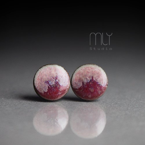 Oryginalne ceramiczne kolczyki w formie sztyftów, ręcznie wykonane z delikatnej gliny kamionkowej, jednostronnie szkliwione błyszczącym różowym szkliwem, na antyalergicznych sztyftach w kolorze srebrnym. Średnica ok 11mm