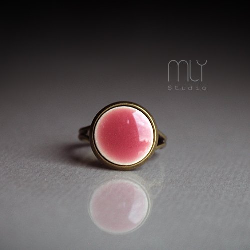 Efektowny pierścień z ceramicznym oczkiem, ręcznie wykonanym z jasnobeżowej gliny kamionkowej, poszkliwionym mieszanką różowych szkliw z efektem plamek.Obrączka regulowana w kolorze starego złota, średnica oczka ok 12mm. Polecam