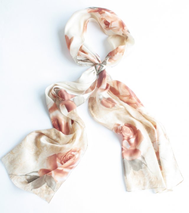 Zwiewny różany szal w stonowanych odcieniach, na beżowym tle.Wykonany prawdopodobnie z poliestru.