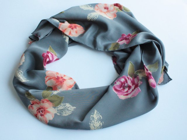 Piękny szal w róże na szarym tle. Materiał oceniam na jedwab, brzegi są rolowane.