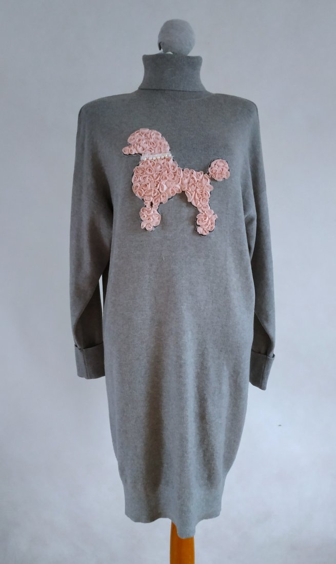 ładny odcień szarości, dzianina nie jest za gruba, ale jest sprężysta. Na przodzie gości pudelek jasno różowy, zrobiony z wstążkowych różyczek, obszyty drobnymi cekinkami. Stan idealny.