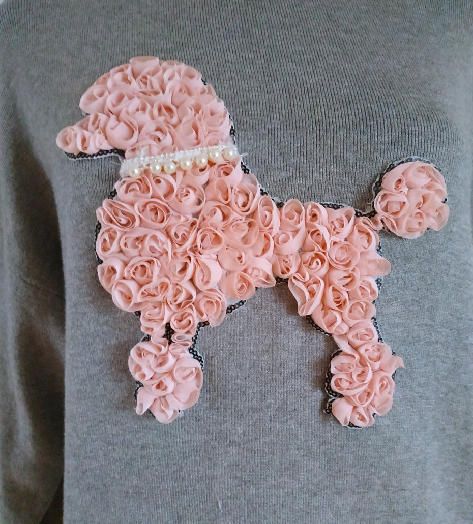 ładny odcień szarości, dzianina nie jest za gruba, ale jest sprężysta. Na przodzie gości pudelek jasno różowy, zrobiony z wstążkowych różyczek, obszyty drobnymi cekinkami. Stan idealny.