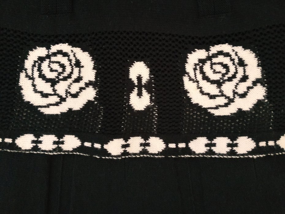 czarna, u dołu ażurowy szlaczek z wrabianymi różami w złamanej bieli.Szerszy pas dopasowujący się do figury.