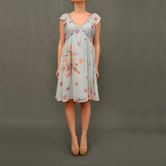 Błękitna sukienka w róże. Bardzo dziewczęca. Linia przy dekolcie ozdobiona dżetami. Ukośnie pod biustem odcięta i puszczona luźno. Na podszewce. Materiał zwiewny. Marka KAPPAHL.