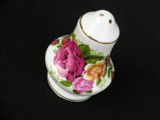 Elegancka porcelanowa pieprzniczka, sygnowana, angielska. Z wyrazistym, bogatym zdobieniem różanym. Na błyszcząco szkliwiona. Gdzieniegdzie złocenia. Przyjemny kształt i wygodny rozmiar. Ozdoba codziennego stołu to już celebracja :) Od spodu plastikowa zatyczka. 5,3 x 8 cm. Stan zachowania bardzo dobry.