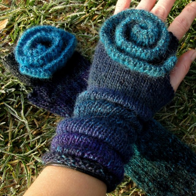 Ekstrawaganckie mitenki wykonane ręcznie z wysokiej jakości włóczki ( 75%wełna, 25% poliamid) w przepięknych odcieniach granatu, turkusu, fioletu... Ozdobione przestrzennym, geometrycznym w formie kwiatem. Miękkie i miłe w dotyku. Niebanalny dodatek i ochrona przed chłodem. Długość: ok. 28 cm. Wzór autorski. Polecam serdecznie.