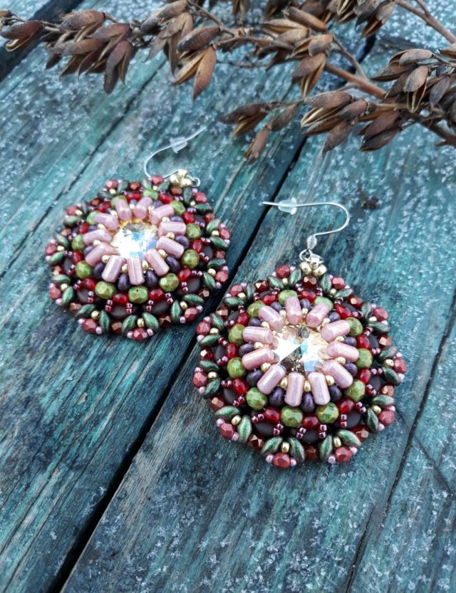 ,,rozetki w różu i zieleni,, to ażurowe kolczyki wykonane z brzoskwiniowej rivoli oplecionej szklanymi koralikami i kryształkami w różnych odcieniach różu, zieleni, fioletu i brązu. Kolczyki zawieszone są na klasycznych biglach wykonanych ze stali szlachetnej.