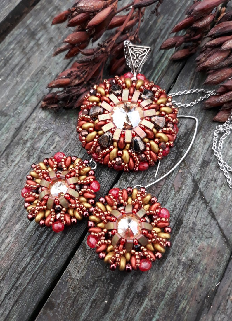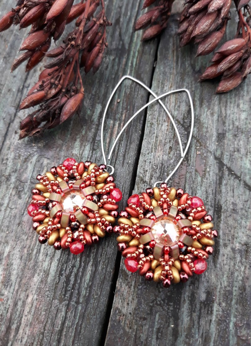 ,,rozetki w złocie i brązie,, to ażurowe kolczyki wykonane ze szklanej rivoli oplecionej koralikami i kryształkami w różnych odcieniach złota, brązu i czerwieni. Kolczyki zawieszone są na ozdobnych biglach typu rybki wykonanych ze stali szlachetnej.