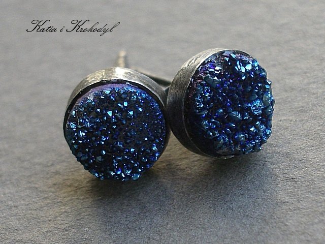 Kolczyki sztyfty wykonane własnoręcznie od podstaw ze srebra [pr.925 i 999] w połączeniu z druzami agatów pokrytych tytanem w kolorze ciemno niebieskim [śr,9mm]. Kamyczki pod wpływem padania światła skrzą się .Srebro oksydowane i przetarte. Biżuteria ozdobnie zapakowana