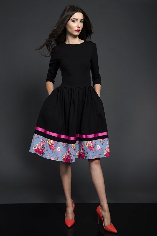 Oryginalna kobieca sukienka uszyta z grubszej wytrzymałej czarnej dzianiny. Dół sukienki ozdobiony bawełnianą kwiecistą listwą i starannie naszytą rypsową tasiemką w kolorze fuksji.
