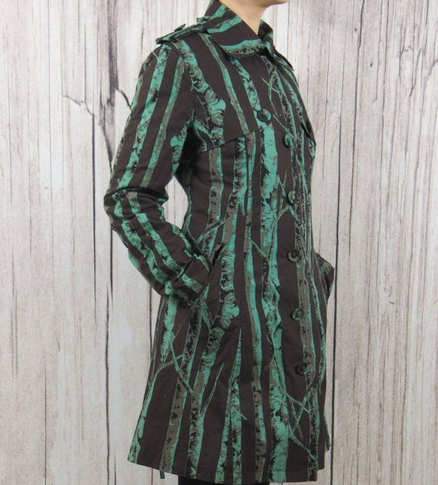 Cudowny płaszcz od st-martins. Motyw drzew, szerokość regulowana gorsetowym wiązaniem na plecach. Bawełniany, podszewka z poliestru. Płaszczyk jest lekko ocieplany (w środku cienka warstwa wypełnienia - w dotyku watowego). Płaszczyk cudownie sprawdzi się na koniec zimy/ wczesną wiosną. Można go nosić z dużą klapą lub podpięty pod szyję.