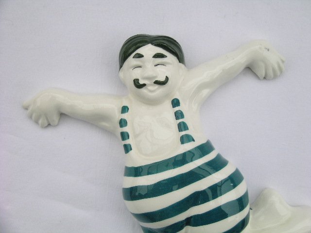Prześmieszna ceramiczna dekoracja łazienkowa - do położenia lub powieszenia. Replika dawnego wzoru. Pan Plażowicz w absolutnie wyluzowanej pozie :) Na błyszcząco szkliwiona. 18,5 x 19 x 4,5 cm. Z tyłu dziurki do zawieszenia. Stan zachowania dobry. Od spodu / niewidoczny z zewnątrz / uszczerbek.