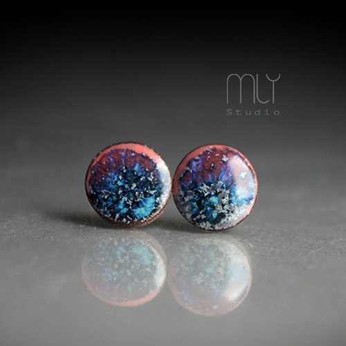 Okrągłe, lekko nieregularne ceramiczne kolczyki w formie sztyftów, ręcznie wykonane z delikatnej gliny kamionkowej, jednostronnie szkliwione zielono czerwonym szkliwem z efektem plamek i pięknym połyskiem, na sztyftach w kolorze srebrnym. Średnica ok. 11mm.Polecam