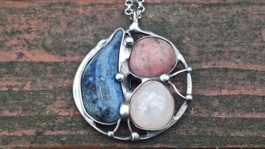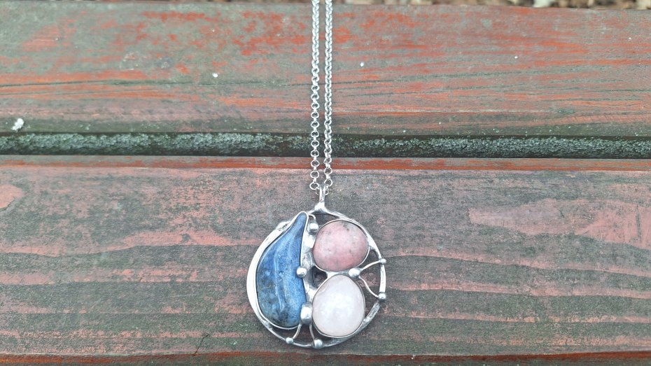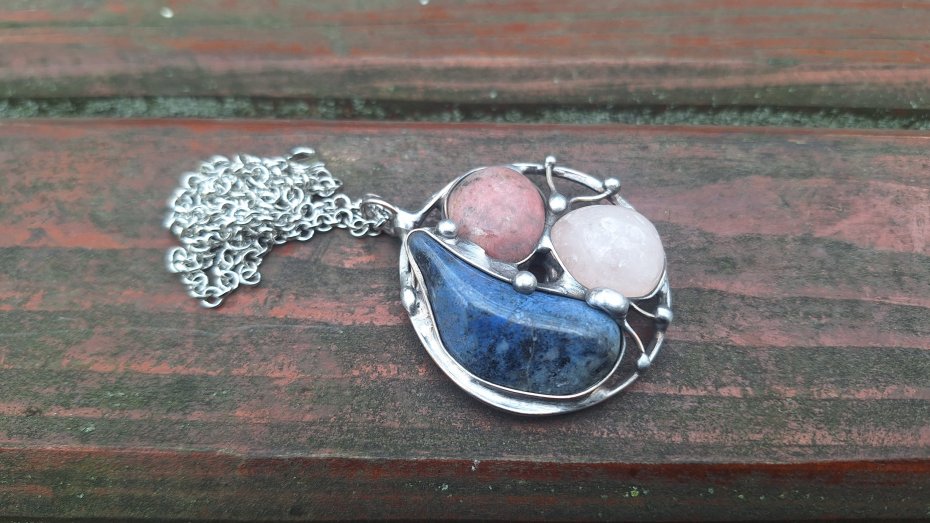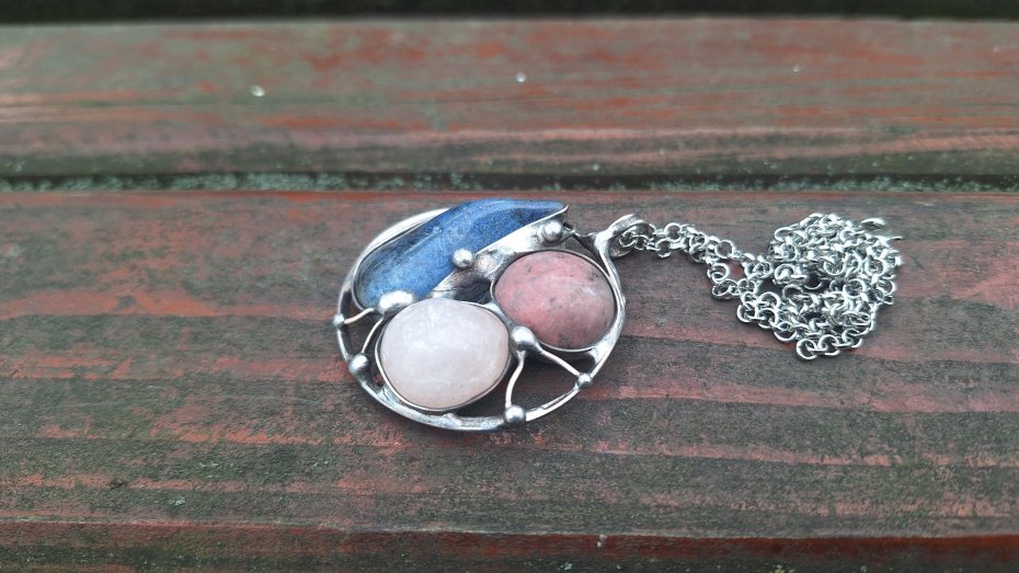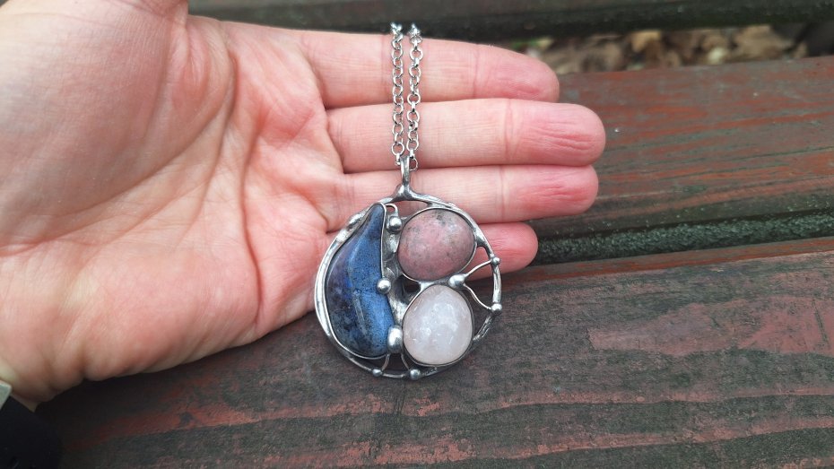 Wisiorek wykonany z miedzi, cyny, rodonitu, różowego kwarcu i sodalitu. Wymiary ok. 4.5 na 4.5 cm. Zawieszony na łańcuszku o długości ok. 50 cm.