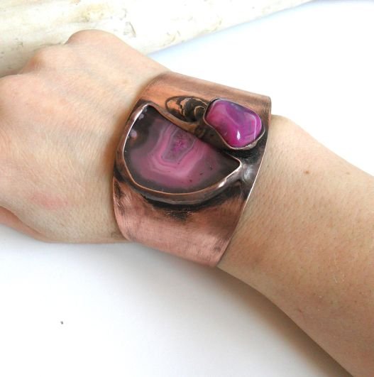 Bransoleta z różowymi agatami na oksydowanej miedzi.Wysokość bransoletki z przodu 4cm.Otwarta,do regulacji.