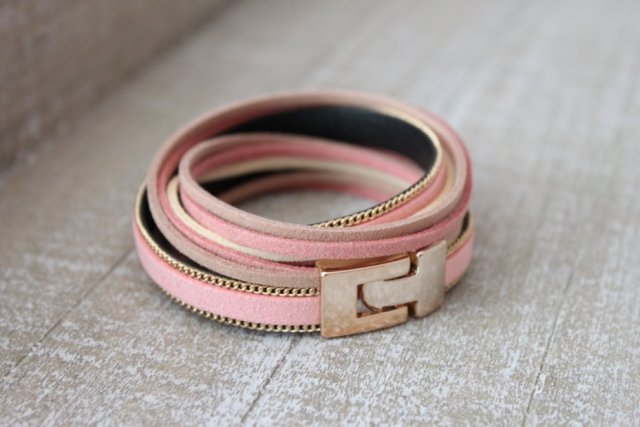 Pastelowa różowa bransoletka wykonana z ekozamszu. Bransoleta do dwukrotnego zawinięcia wokół nadgarstka. Całkowita długość bransolety 39,5 cm. Kolory rzemieni: pastelowy różowy, pudrowy różowy, cappucinno, kość słoniowa. Zapięcie w kolorze rose gold.