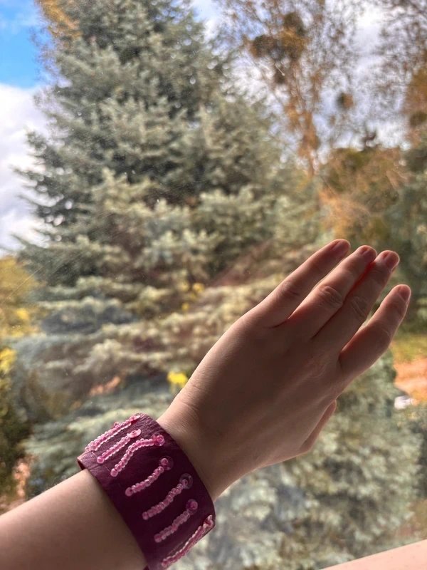 Nietuzinkowa bransoletka wykonana z różowego materiału przypominającego skórę, ozdobiona cekinami i koralikami.