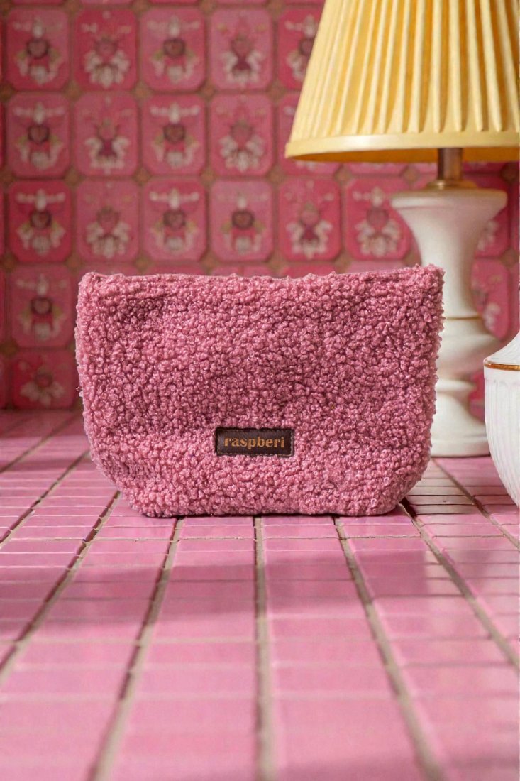 Duża kosmetyczka w kolorze różowym z tkaniny typu bukla.