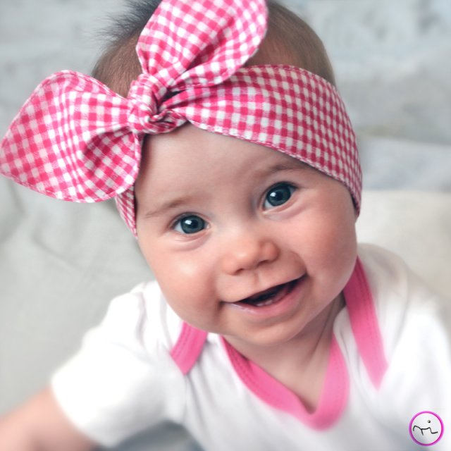 Śliczna kokardka na główkę dla małej księżniczki wykonana została z bawełny w różową kratkę. Opaska wiązana, szyta na wymiar (w zmówieniu proszę podać obwód główki maluszka).