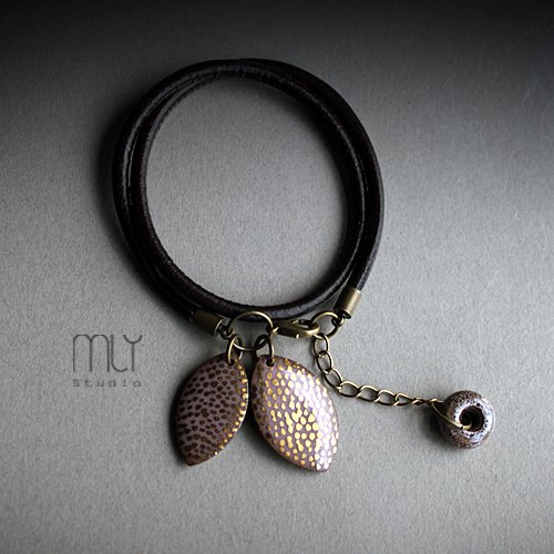 Efektowna bransoletka wykonana z rzemienia jubilerskiego, elementów w kolorze starego złota i ręcznie wykonanych ceramicznych zawieszek, szkliwionych mieszanką różowych szkliw z efektem złotych plamek, Obwód regulowany. Polecam. Termin realizacji zamówienia to 1-2 dni.