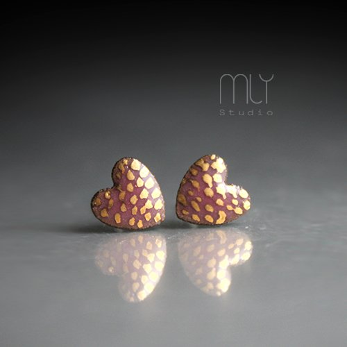 Ceramiczne okrągłe kolczyki, ręcznie wykonane z delikatnej gliny kamionkowej, jednostronnie szkliwione różowym błyszczącym szkliwem, dekorowane kalką ceramiczną z dodatkiem złota (układ plamek może różnić się od przedstawionego na zdjęciu),na antyalergicznych sztyftach w kolorze srebrnym. Średnica ok. 7mm. Polecam . Termin realizacji zamówienia to 1-2 dni.