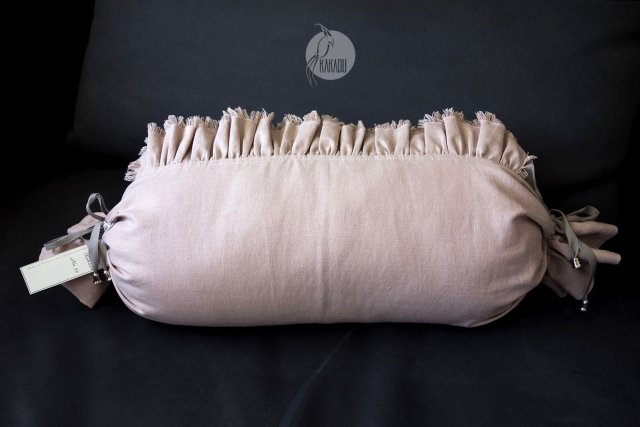Piękny, misternie uszyty wałek dekoracyjny z mięciutkiego, pastelowego, brudnoróżowego lnu ze strzępioną, podwójna falbaną zabezpieczoną przed pruciem.