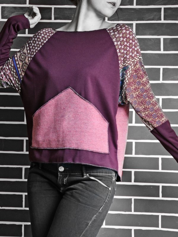 Bluza oversize wykonana została z różowej dzianiny (dzianina swetrowa, od lewej strony miękka, przyjemna w dotyku). Rękawki i przód wykonane z cieńszej, elastycznej dzianiny. Prosty krój, bardzo wygodna. Rozmiar M