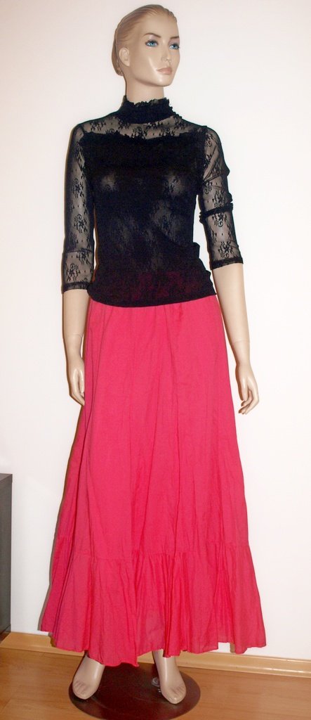 Śliczna bawełniana długa spódnica na gumie marki Zara, z klinów, ślicznie się układa. Dół z doszytą falbaną. Kolor intensywnie różowy. Materiał 100% bawełna, cienka, delikatna, pod spodem także bawełniana podszewka. Stan bardzo dobry. Rozmiar z metki M, Podaję wymiary mierzone na płasko;
