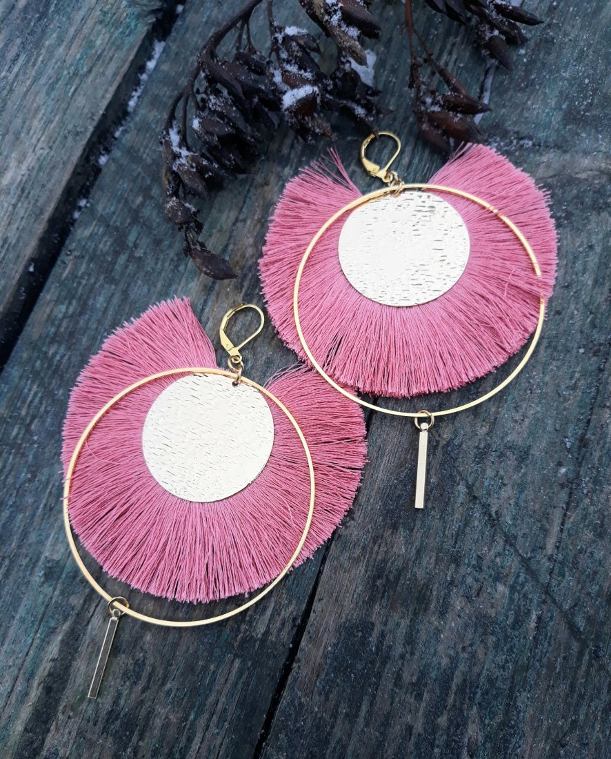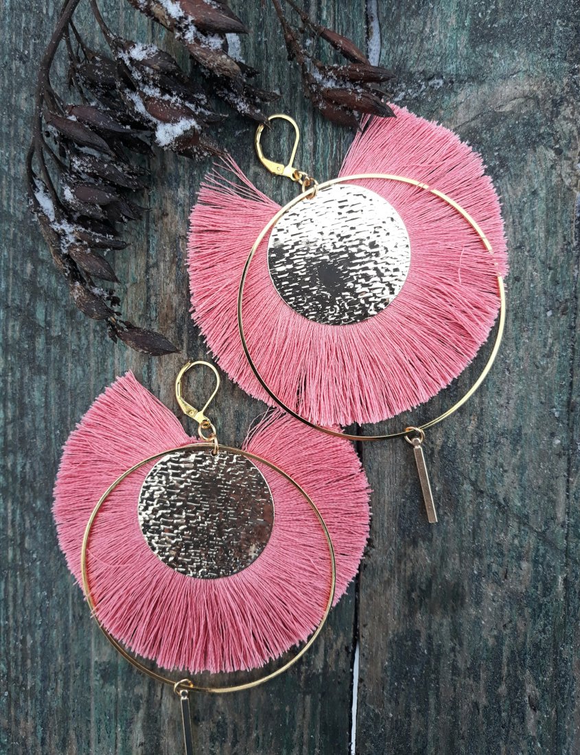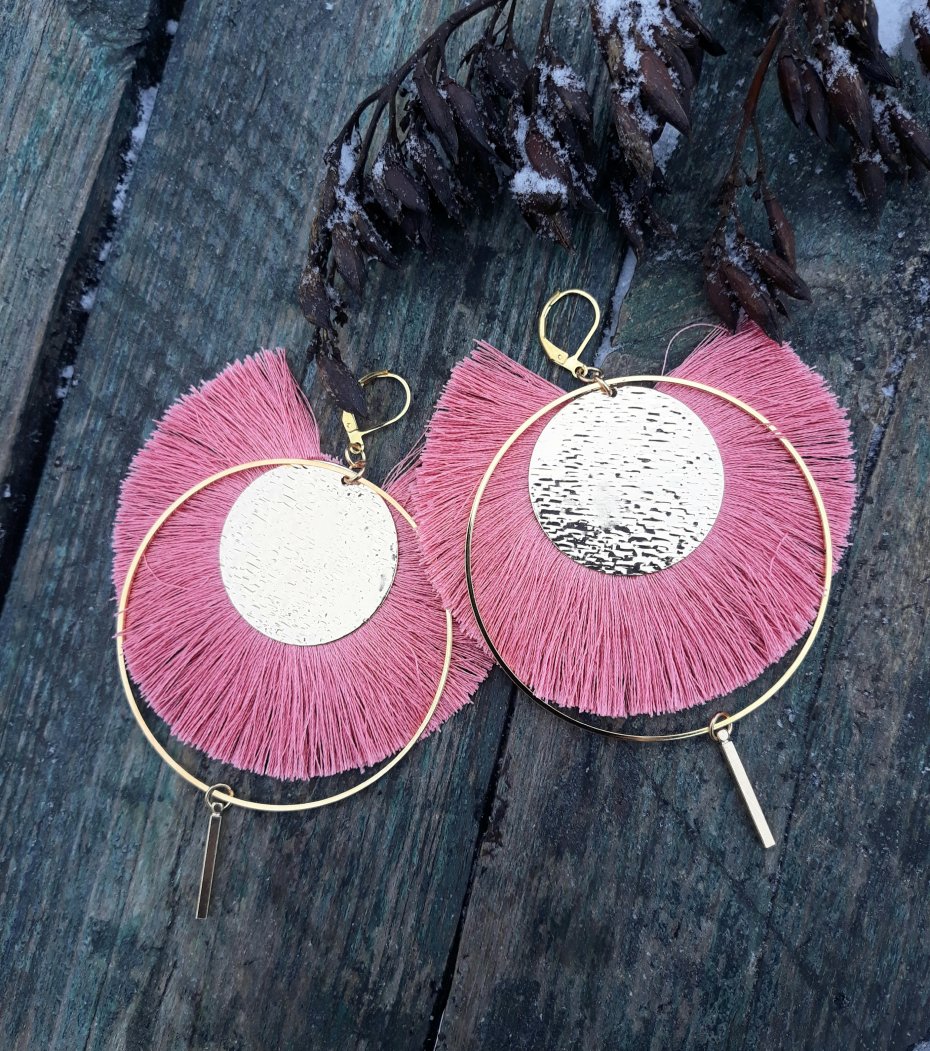 ,,różowe,, to duże kolczyki wykonane z chwosta na obręczy i metalowych elementów w kolorze ciepłego złota. Kolczyki zawieszone są na ozdobnych biglach typu angielskiego wykonanych ze stali szlachetnej.
