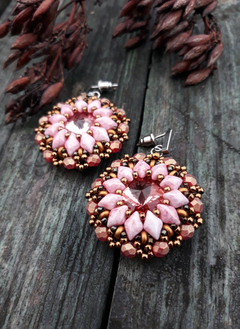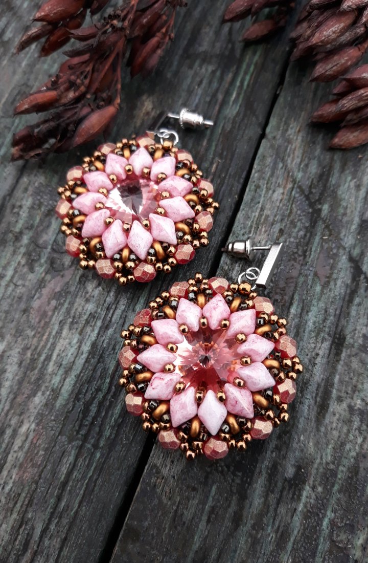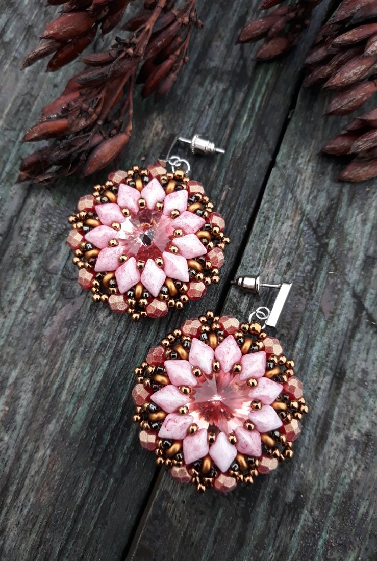 ,,różowe ażurowe,, to kolczyki utrzymane w kolorystyce różu,metalicznego brązu i złota, wykonane ze szklanych koralików i kryształków. Kolczyki zawieszone są na ozdobnych biglach typu sztyft wykonanych ze stali szlachetnej.