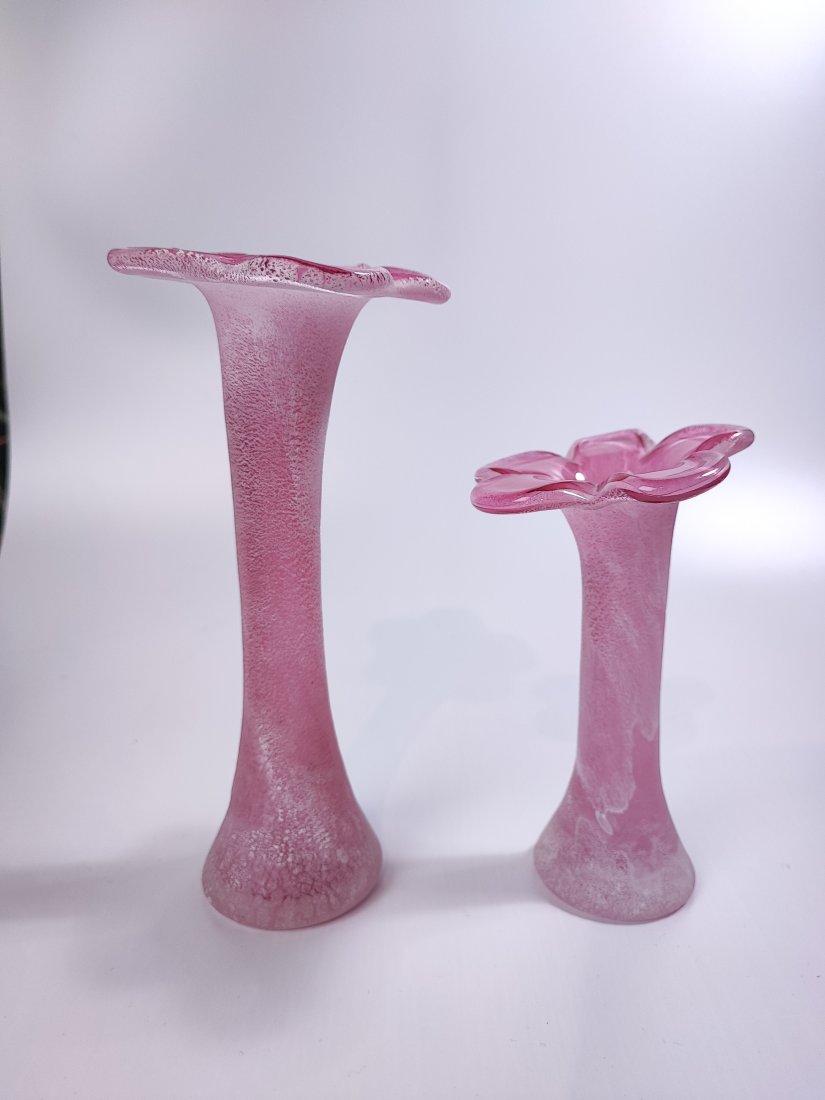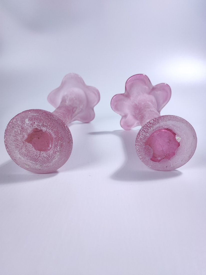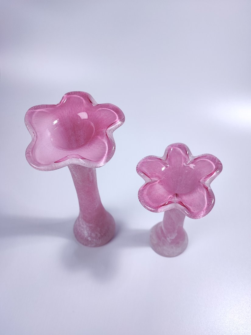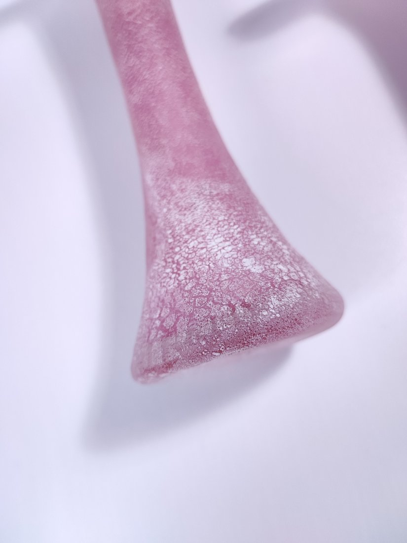 Para ręcznie dmuchanych wazoników z regionu Nový Bor. Smukła, wydłużona forma oraz ziarniste mrożone wykończenie tworzą efekt delikatnej, pudrowej struktury.